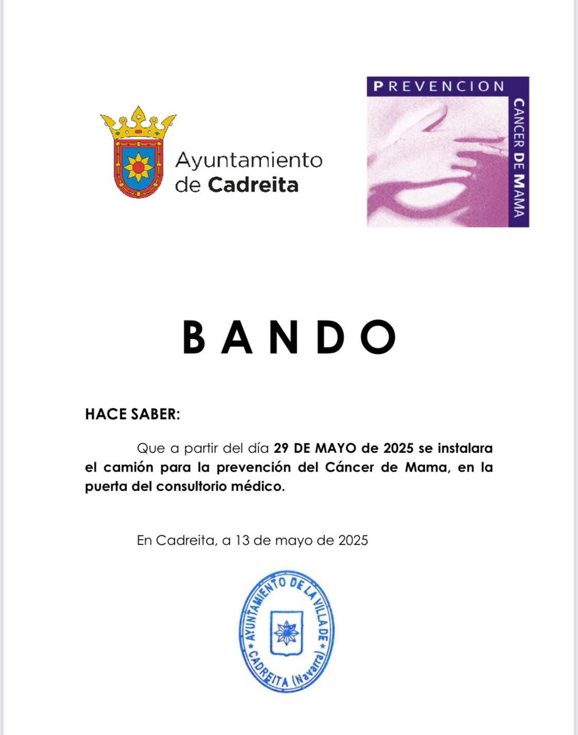 A partir del jueves 29 de mayo se instalará el camión para la prevención del Cáncer de Mama. Lugar: puerta del consultorio médico.