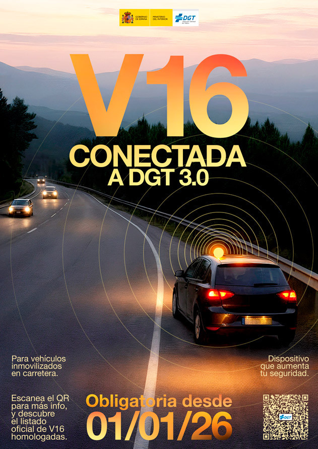 El dispositivo V-16 conectado será el único medio legal de señalización de vehículos inmovilizados a partir del 1 de enero de 2026 y sustituirá a los triángulos. Información completa pulsando en "+ Info".