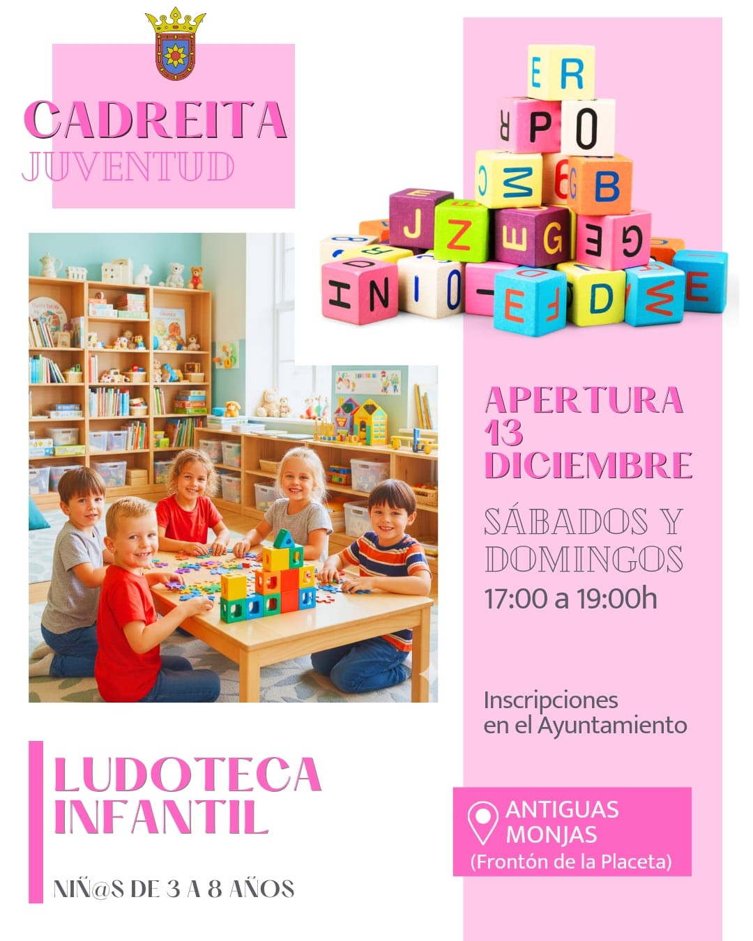 Niñ@s de 3 a 8 años. Sábados y domingos De 17:00 a 19:00 h Inscripciones en el Ayuntamiento. Más información en cartel adjunto.
