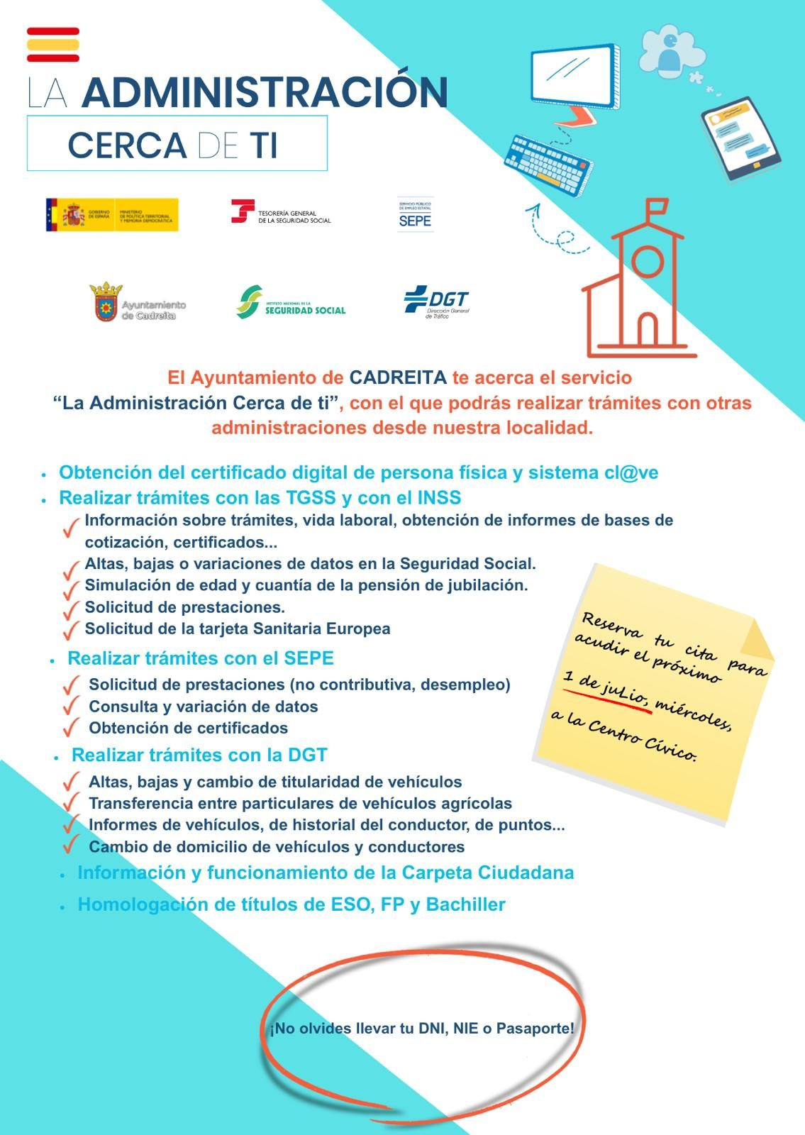 Servicio del Ayuntamiento de Cadreita para realizar trámites administrativos con diferentes organismos desde la localidad, incluyendo obtención de certificados digitales, trámites con Seguridad Social, SEPE, DGT y homologación de títulos educativos.